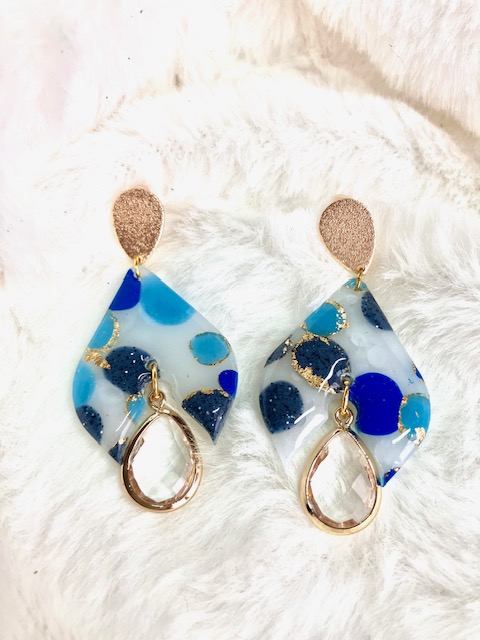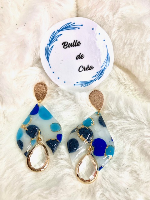 BO en pâte polymère faite à la main avec pendant en verre transparent , touche brillante donnée grâce à une légère couche de résine. Attache par clous en acier inoxydable.