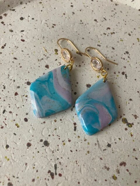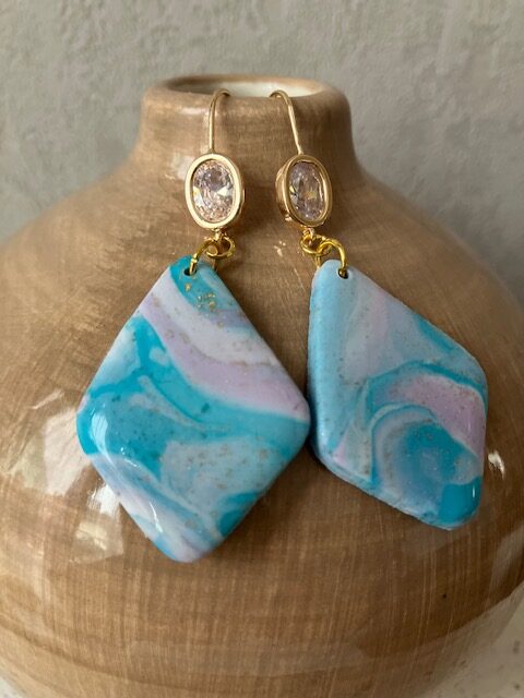 Forme losange dans les tons bleu et rose avec une pointe de doré. Elles sont montées sur des attaches forme crochet en plaqué or.