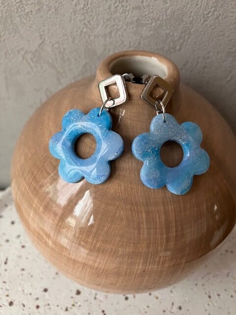 BO faite à la main en pâte polymère, couleur bleue et argent, monté sur une attache clou forme géométrique en acier inoxydable argent.