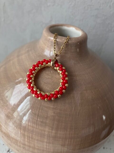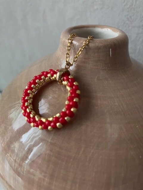 Couleur rouge et doré, monté sur une chaine en acier inoxydable doré.