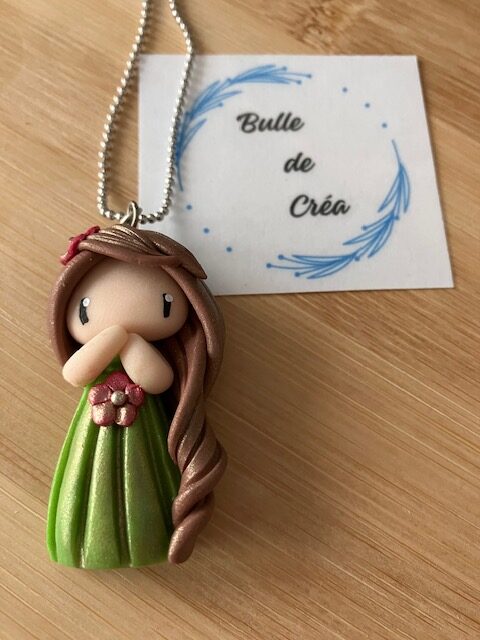 Pendentif petite poupée en pâte polymère faite main.