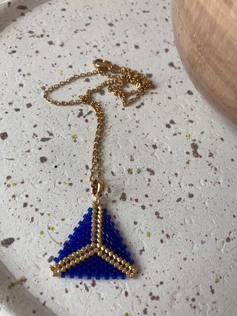 Pendentif triangulaire tissé à la main avec de véritables perles japonaises Miyuki de couleur dorée et bleue.