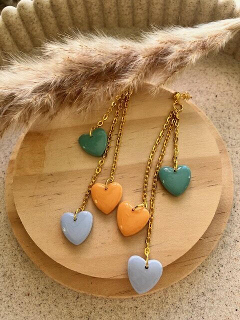 boucle d’oreille modèle Love tricolore (vert océan, papaye et bleu ciel), petit clou rond en acier inoxydable doré.