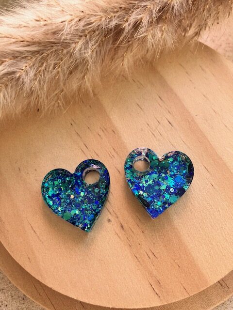 recharge pour créole modèle cœur en résine avec inclusion de paillettes vertes et bleues