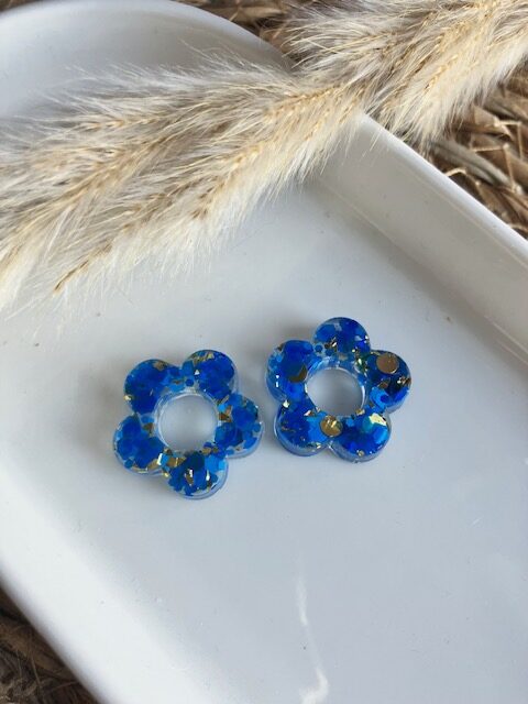 recharge pour créole modèle petite fleur en résine avec inclusion de paillettes or et bleues