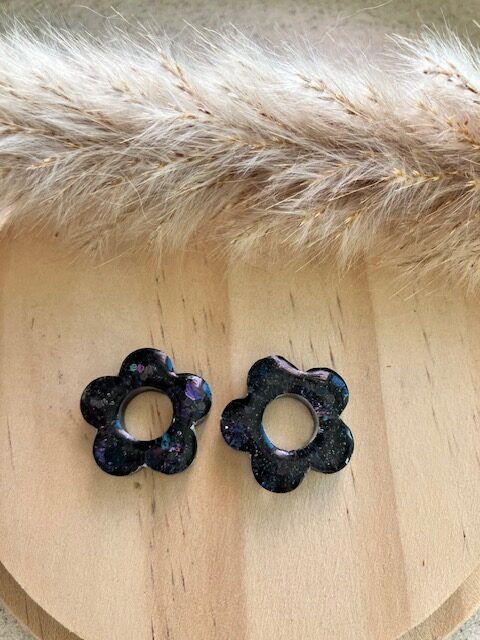 recharge pour créole modèle petite fleur en résine avec inclusion de paillettes noires